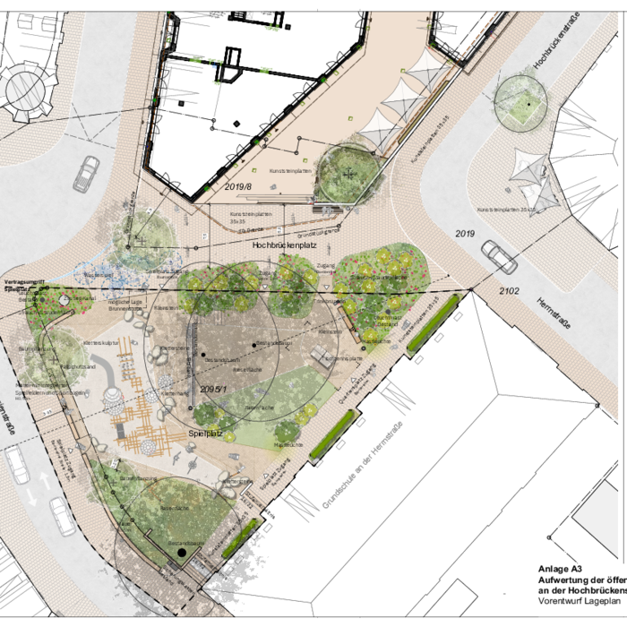 - Aufwertung eines Freiraums auf ca. 820 qm: Platz an der Hochbrückenstraße wird zu einem attraktiven Quartiersplatz und Spielort für alle Generationen umgewandelt