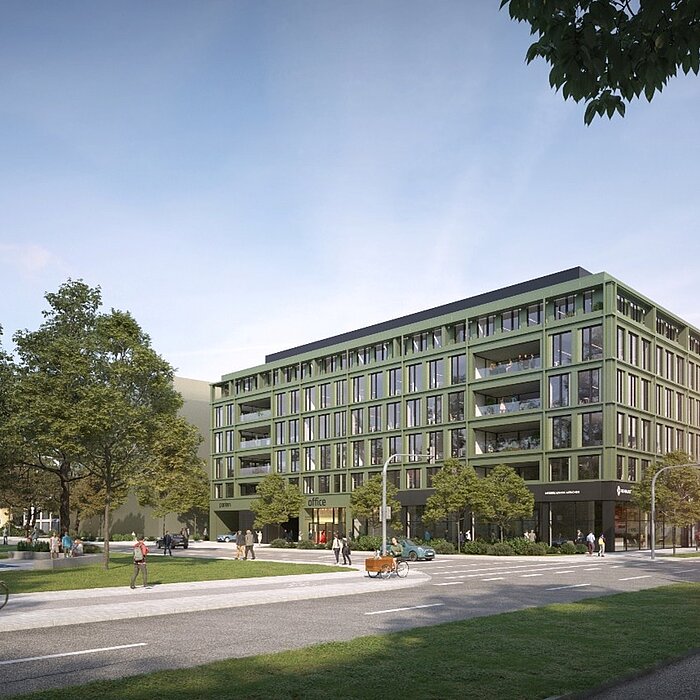 Auch im Stadtraum überzeugt die Architektur. Die grün akzentuierte, hochwertige Fassade setzt einen markanten Punkt im Stadtbild und wertet die Umgebung nachhaltig auf. Ein optimiertes Verhältnis von Fassadenflächen und Raumtiefen sorgt für eine hohe Energieeffizienz und ideale Arbeitsbedingungen. So entsteht Architektur mit echtem Mehrwert – wirtschaftlich, ökologisch und flexibel.
